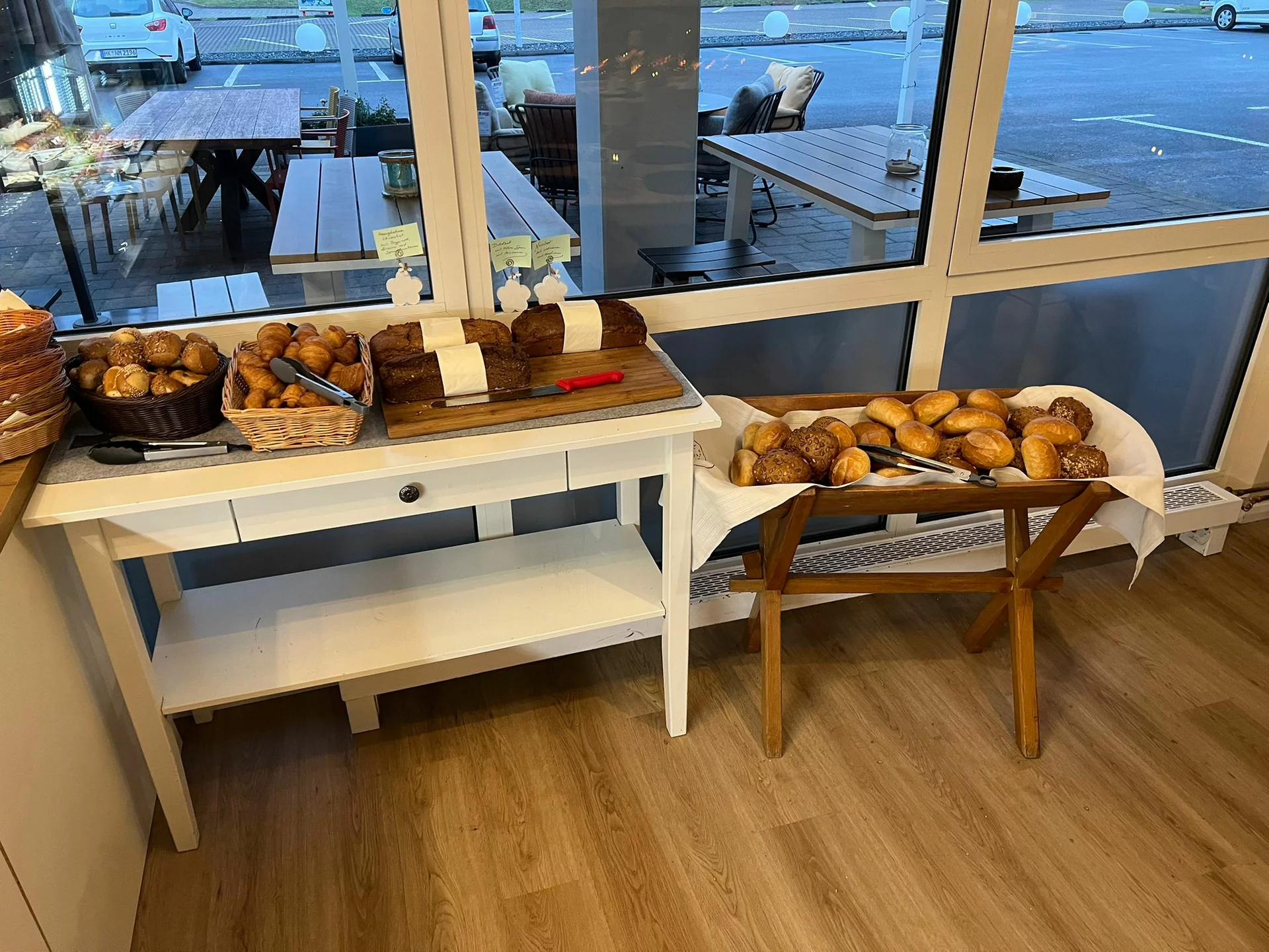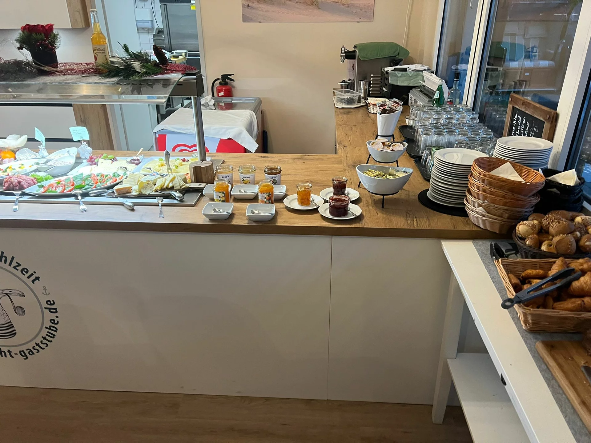 Weizenbrötchen, Vollkornbrötchen, Croissants, Butter, Honig, Marmelade, Wurst, Käse, Rührei, Joghurt, Tomate-Mozarella, Obstsalat und ein Glas Prosecco pro Person 16.90
